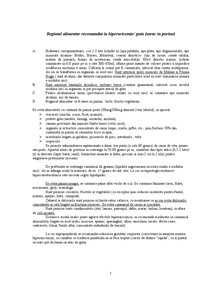 Alimentele cu 400 mg sau mai mult acid uric sunt considerate ca fiind bogate în purine care determină acid uric și trebuie evitate complet. Limitati consumul de alimente de origine animală pește și linte dacă suferiți de gout.