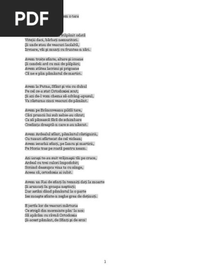 Avem o ţară unde au stăpânit odată vitejii daci bărbaţi nemuritori. şi unde stau de veacuri laolaltă izvoare văi şi munţi cu fruntea n zări. Avem troiţe sfinte altare şi icoane şi candeli ard cu mii de pâlpâiri. Avem troiţe sfinte altare şi icoane şi candeli ard cu mii de pâlpâiri.