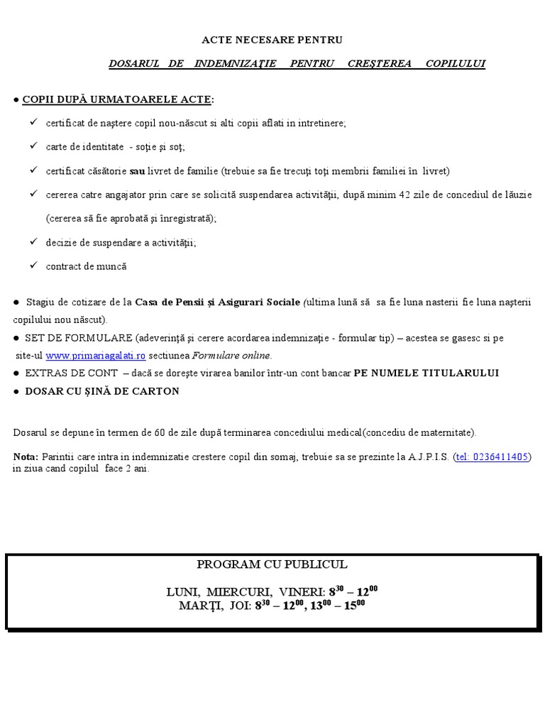 Cand se depune dosarul de indemnizatie. Indemnizația de șomaj pentru absolvenți de liceu reprezintă 50 din valoarea isr și se acordă după 60 de zile calendaristice de la data absolvirii. Actele se depun la primaria de domiciliu. Asadar vei depune dosarul pentru indemnizatie de crestere copil in termen de 60 de zile de la finalizarea concediului de maternitate minim 42 de zile de postnatal. Unde se depun actele.