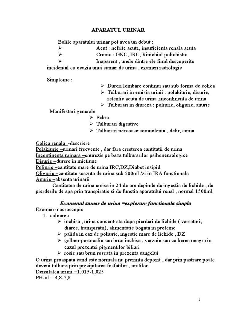 în continuare timp de 24 de ore pe parcursul întregii zile şi nopţi până a doua zi la aceeași oră va colecta urina în recipient. Cantitatea de urina 24 ore este in medie 1 5l. Limita inferioara a cantitatii de urina este de 700 800 mililitri in 24 de ore tot ce este sub aceasta valoare se numeste oligurie. Obiective obtinerea datelor privind starea morfofunctionala a aparatului renal.