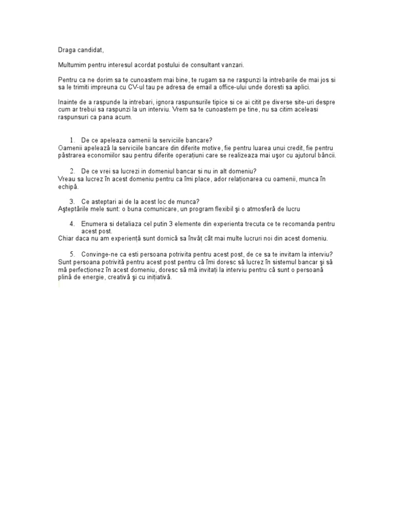 De ce vrei sa lucrezi la noi. Vino si tu in echipa noastra. In primele zile ne vom cunoaste mai bine. Este foarte important sa dai niste motive pertinente. Desi multi se tem sa raspunda acestei intrebari tu invata sa iei acest lucru ca o oportunitate de a te pozitiona si de a obtine un avantaj competitiv fata de ceilalti candidati.