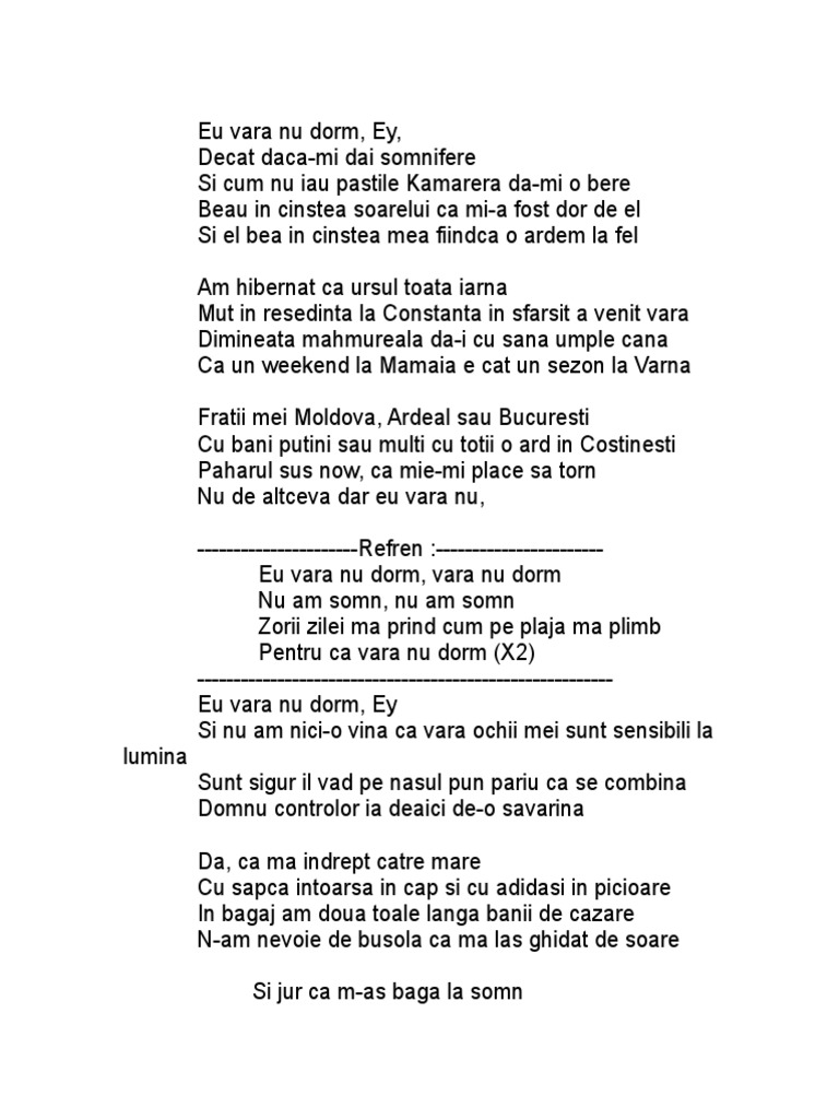 Eu vara nu dorm versuri si acorduri. Cu capodastru pe iii se canta urmatoarele acorduri. Pop transpunerile de pe acest site reprezintă viziunea personală a utilizatorilor asupra pieselor. 1 eu vara nu dorm ai decât dacă mi dai somnifere şi cum nu iau pastile camareră dă mi o bere. Versuri vara nu dorm de conecte r.
