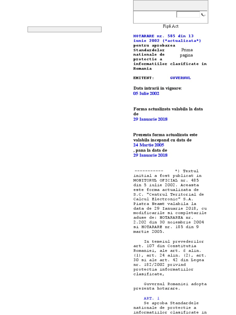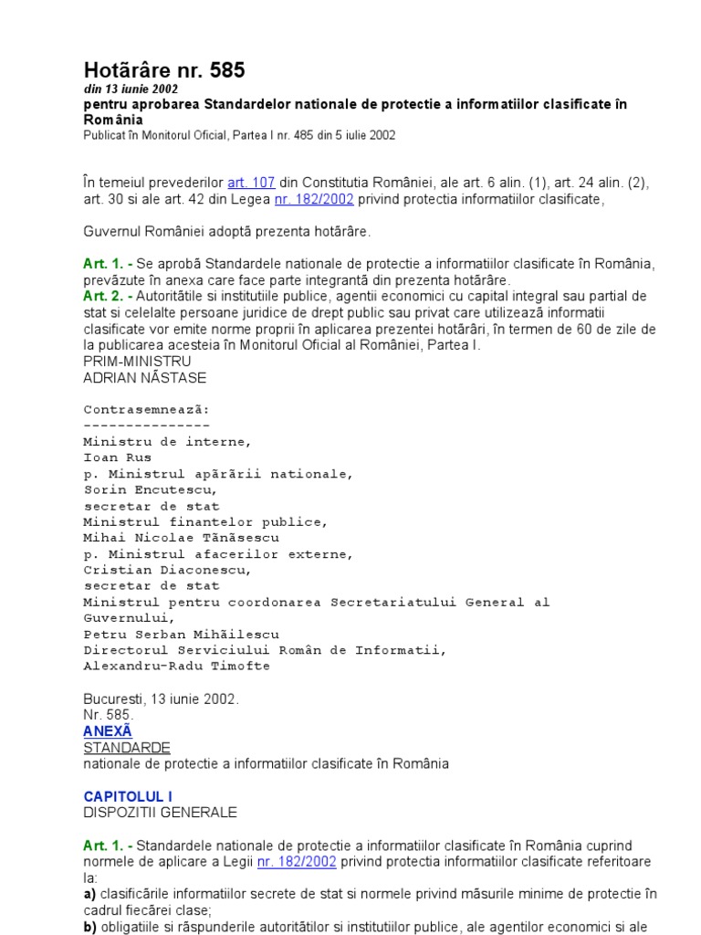 H g nr 585 din 13 iunie 2002 actualizata. 585 din 13 iunie 2002 pentru aprobarea standardelor nationale de protectie a informatiilor clasificate in romania emitent. 485 din 5 iulie 2002. Capitolul i dispoziţii generale capitolul ii clasificarea şi declasificarea informaţiilor. 30 si ale art.