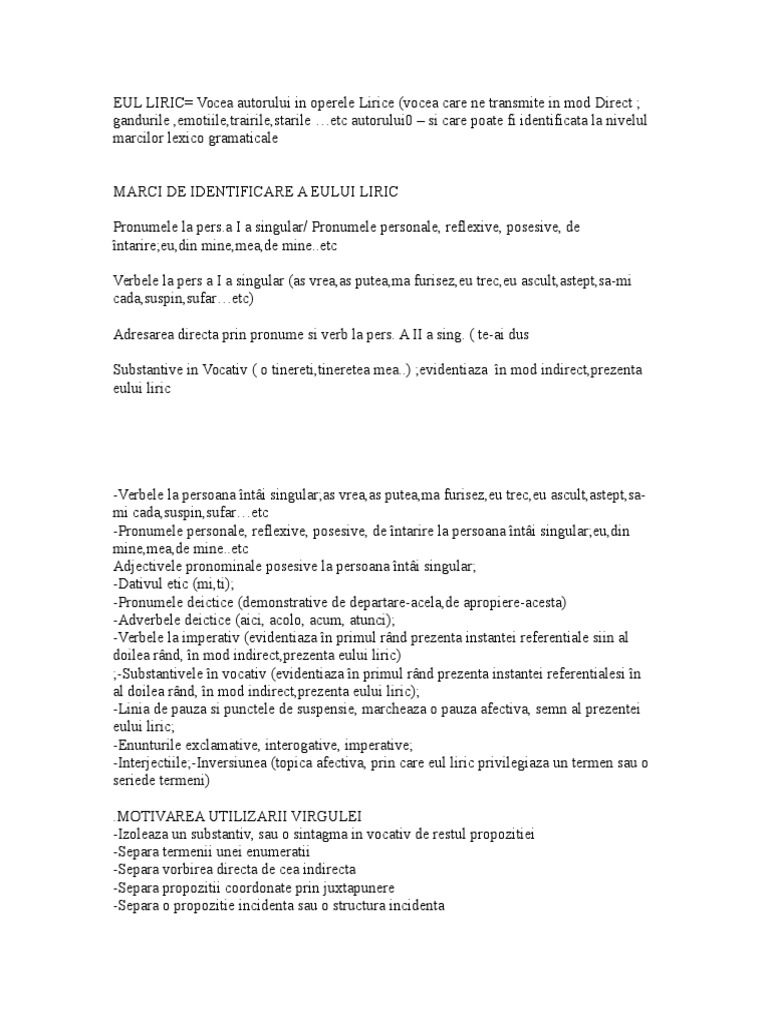 Daca vrei sa formulezi frumos intr un enunt poti sa scrii cam asa. Prezenta pronumelor personale si ale verbelor la persoana i si a ii a singular si. Eul liric este vocea autorului în operele aparținând genului liric și poate fi identificat la nivelul mărcilor lexico gramaticale. Marcile lexi gramaticale ale e ului liric in mentionezi poezia sunt.