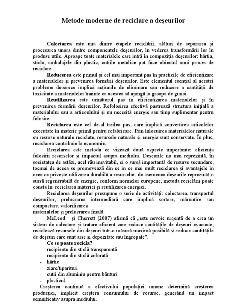 Metode de reciclare a deseurilor. Producem o gama larga de masini de inalta performanta cu proprietati de durabilitate excelente caracteristici de rezistenta si design. Metode de tratare ale deseurilor. In principiu deseurile pot fi scoase din circuitul economic eliminate sau reintroduse in circuit recuperate. Metode inovative de reciclare într o lume în care colectarea selectivă a deșeurilor este o problemă.