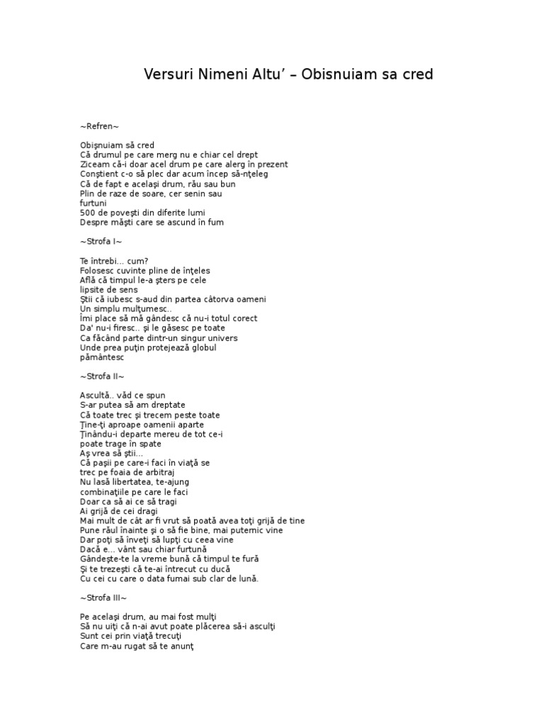 Obisnuiam sa cred versuri. Obisnuiam sa cred ca lumea e prea mare s o iau la pasi marunti orice imi sta in cale nu mi schimba mersul as putea muta si munti chiar daca timpul trece eu nu ma voi schimba o iau pe aceeasi ruta in calatoria mea. Refren obişnuiam să cred că drumul pe care merg nu e chiar cel drept ziceam că i doar acel. Nu stiu unde merg unde ma duc dar stiu ca sunt aproape de un nou inceput inchid ochii si incep sa ascult. Versuri obişnuiam să cred de nimeni altu.