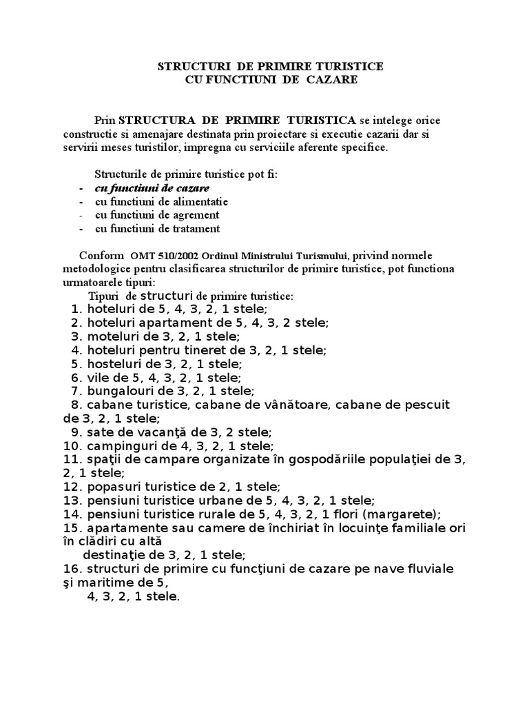 Structurile de primire turistice include hoteluri moteluri vile cabane campinguri nave fluviale si maritime care dispun de spatii de cazare sate de vacanta pensiuni pensiuni agro turistice si alte unitati cu functiuni de cazare unitatile de alimentatie din incinta acestora unitatile de alimentatie publica situate in statiunile turistice dar si cele care sunt administrate de societati comerciale de turism indiferent de amplasament de forma de organizare si de proprietate. Tipuri de structuri de primire cu funcțiuni de cazare turistică norma metodologică privind clasificarea pe stele și categorii a structurilor de primire turistice din 27 06 1995 prin utilizarea lege5 îți exprimi acordul cu privire la faptul că folosim module cookie în scopul îmbunătățirii conținutului în vederea analizării traficului precum și împotriva utilizării neautorizate. Unitati de alimentatie din incinta structurilor de primire cu functiuni de cazare unitati de alimentatie publica situate in municipii si in statiuni turistice. Capitolul v organizarea unei structuri de primire turistice cu functiuni de cazare v 1.