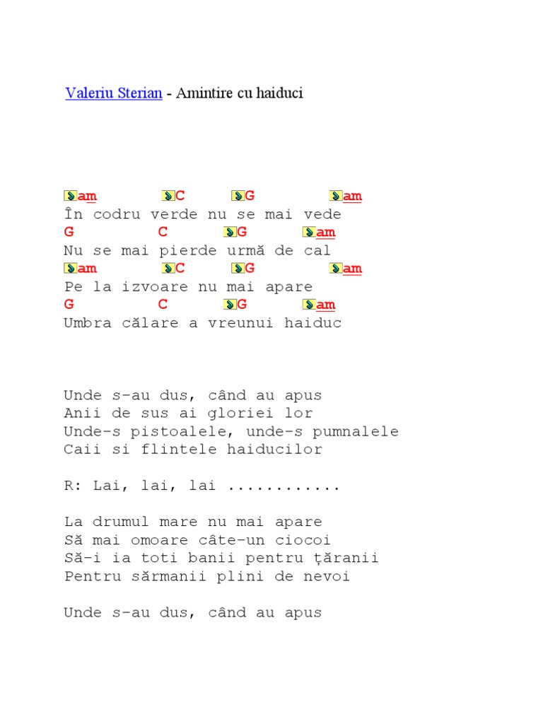 Valeriu sterian amintire cu haiduci. Versurile piesei amintire cu haiduci strofa 1 în codrul verde nu se mai pierde. Asculta melodia amintire cu haiduci in albumul muzică folk vol. 1 in codru verde nu se mai pierde nu se mai vede urma de cal pe la izvoare nu mai apare umbra calare a vreunui haiduc 2. Em g d em în codru verde nu se mai pierde d g d em nu se mai vede urmă de cal pe la izvoare nu mai apare umbra călare a vreunui haiduc unde s au dus când au apus anii de sus ai gloriei lor unde s pistoalele unde s pumnalele caii și flintele haiducilor la drumul mare nu mai apare să mai omoare câte un ciocoi să i ia toți banii pentru țăranii pentru sărmanii plini de nevoi unde s au dus când au apus anii de sus ai gloriei lor unde s.